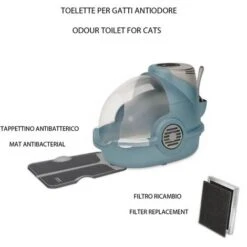 La toilette Vicky con i filtri ai carboni attivi è l’oggetto indispensabile per garantire l’igiene in ogni casa abitata da un gatto. E’ una toilette robusta con un design giovane e si sposa con tutti gli ambienti di casa. La sua grande porta trasparente basculante di 23 cm , il suo coperchio fissato alla vaschetta in quattro punti facilmente rimovibile, e la pratica maniglia per il trasporto, sono caratteristiche che la rendono una super lettiera. La funzionale Toilette Vicky è ideale per gatti di taglia medio o grande.
