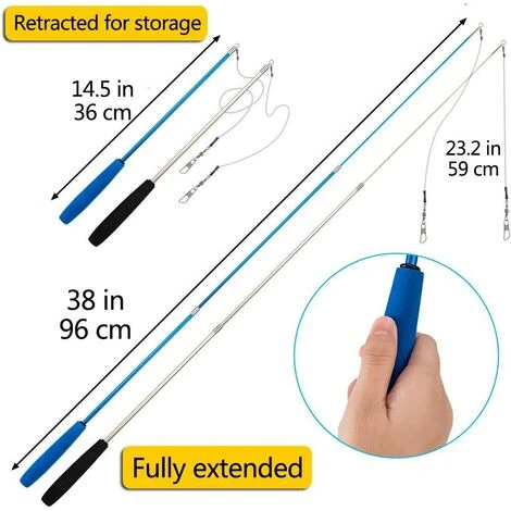 - Retrattile e flessibile: questo giocattolo per gatti con canna da pesca può estendersi facilmente da 36 cm a 96 cm. È flessibile e resistente che può allungarsi fino a 3 superparticolari per prendere in giro. L’asta si estende e si blocca in posizione. È facile da riporre