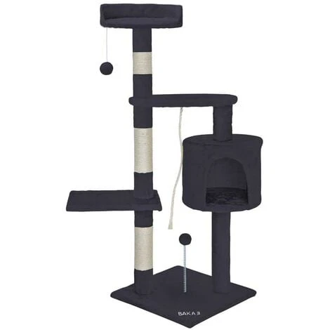 Questo bellissimo albero tiragraffi è composto da ben 3 piattaforme, una quadrata, una ovale e una rotonda con schienale di sicurezza, ha una tana dove il gatto potrà riposare in tutta tranquillità e diversi elementi di gioco come corda e pallina.
