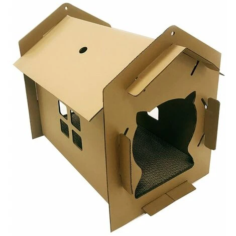 Casetta in cartone per gatti dotata di inserti in cartone ondulato graffiabili nella parte interna. il cartone è un materiale particolarmente amato dai gatti poiché indicato per soddisfare il loro naturale istinto di affondare gli artigli e farsi le unghie. Facile da montare. Consente al gatto anche di rilassarsi in un posto appartato. Il cartone è anche per sua natura isolante, contribuendo a generare un confort termico all’interno. Dimensioni 42x35x50 cm cm. Busta di catnip inclusa: se sparsa sulle parti graffiabili, agisce sull’olfatto del gatto e lo astimola ad utilizzare la parte tiragraffi.Design divertente: anche il tuo amico felino avrà la sua casa.