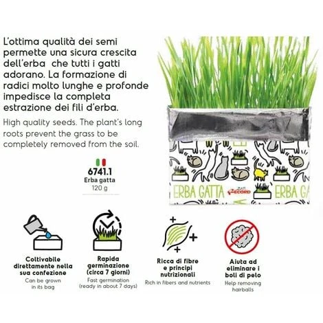 L’erba gatta Erba Katty per gatti di Cat&Rina ha dei semi di ottima qualità, che permettono una sicura crescita dell’erba. La formazione di radici molto lunghe e profonde impedisce la completa estrazione dei fili d’erba.
