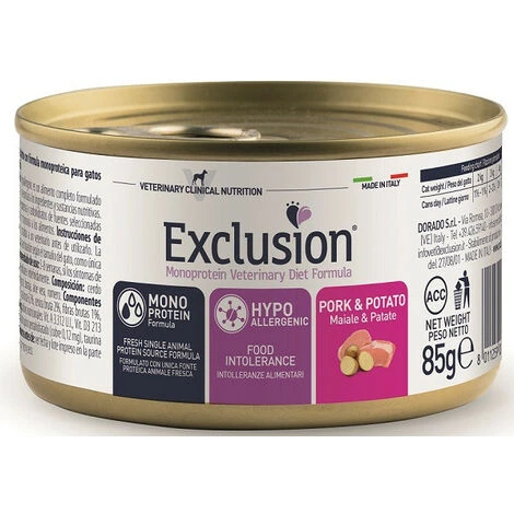 Exclusion Diet Cat Hypoallergenic Maiale e Patate 85 gr Descrizione prodotto: un alimento dietetico completo, formulato per la riduzione delle intolleranze a ingredienti e sostanze nutritive. L’util …