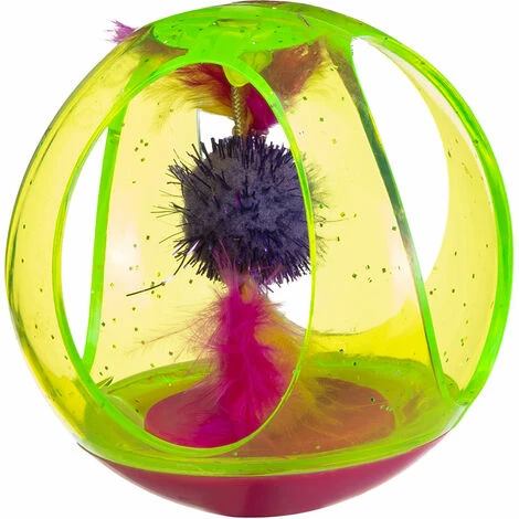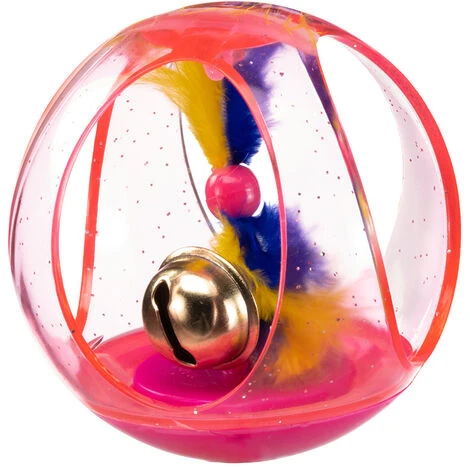 Si tratta, in questa versione, di una pallina in plastica trasparente e colorata con dei grandi fori che permettono di vedere l’interno, nel quale è stato inserito un simpatico peluche. Fate rotolare questa pallina e vedrete come il gatto si divertirà!