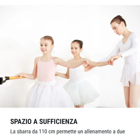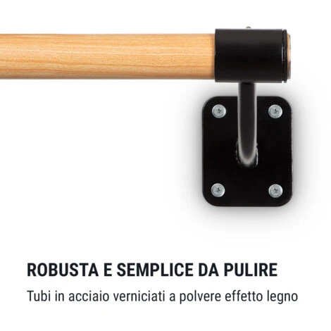 Progettata appositamente per l’allenamento di fitness, danza e balletto: con la sbarra da danza Barre Mur di Klarfit potrai realizzare una grande varietà di esercizi di stretching, allungamento e riscaldamento per la lezione di danza e gli allenamenti fitness. In questo modo migliorerai in ogni sessione di allenamento l’equilibrio, la postura e la flessibilità. Grazie al pratico montaggio a parete salvaspazio, la struttura viene montata in un battibaleno e si adatta non solo alla tua HomeGym, ma anche all’uso professionale nelle palestre, scuole di danza o come attrezzo sportivo durante le lezioni di educazione fisica. La sbarra lunga 110 cm permette l’allenamento simultaneo di 2 persone. La sbarra da danza è estremamente robusta, realizzata completamente in tubi d’acciaio rivestiti a polvere dall’effetto legno alla vista e al tatto. Il diametro della trave di 38 mm garantisce un’ottima presa durante tutti gli esercizi ed è adatta anche ai bambini. Grazie ai materiali refrattari l’attrezzo sportivo è facile da pulire. Il montaggio è semplicissimo, dato che tutti i materiali di fissaggio sono contenuti nel volume di consegna. Le 4 viti per lato garantiscono un’ottima distribuzione del peso.