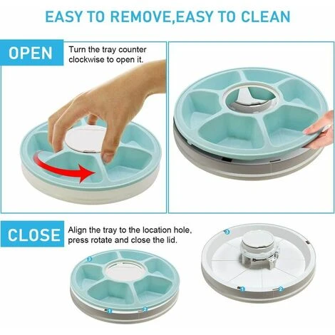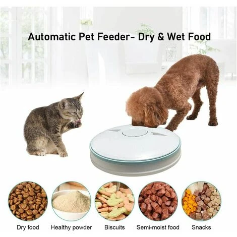 Design a 6 pasti: impostazione massima di 6 pasti in 6 orari diversi in anticipo. L’alimentatore automatico per animali fornisce 6 griglie il cui volume è di 128 ml. Puoi mettere cibo secco o umido a seconda di quanto mangia il tuo animale domestico.