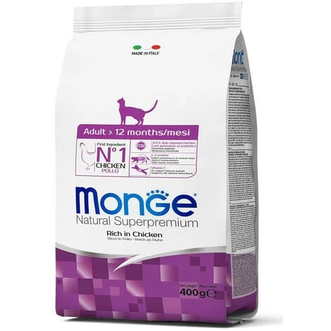 Monge Natural Superpremium Adult sono deliziosi croccantini al gusto pollo. Un alimento completo per gatti adulti e ideale per soggetti che vivono in casa e fuori casa. Garantiscono il benessere del g …