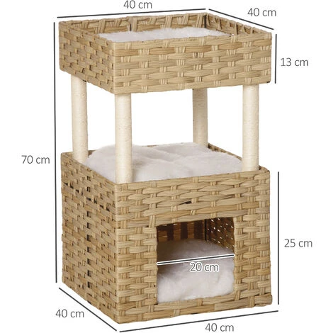 La casetta per gatti PawHut su 3 livelli offre ai tuoi animali tutto lo spazio di cui hanno bisogno per riposare. È composta da una casetta inferiore e 2 piattaforme superiori, e ogni livello è dotato di un morbido cuscino che assicura sonnellini confortevoli. La cuccetta per gatti è rivestita in rattan PE resistente ai graffi dei gatti, per soddisfare il loro istinto di affilarsi le unghie.