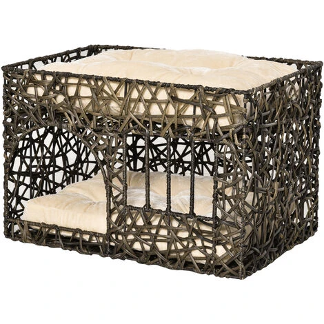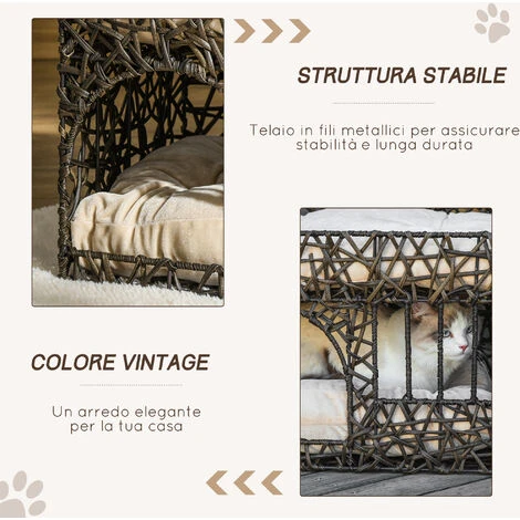 La cuccia in rattan PawHut soddisfa la voglia dei gatti di stare comodi per dormire e rilassarsi. Progettata per animali domestici con peso inferiore a 5kg, è dotata di una struttura in vimini, sorretta da una solida costruzione in filo metallico. Il design a 2 livelli con 2 morbidissimi cuscini in cotone con rivestimento morbido, è ideale per dare loro diversi posti in cui schiacciare un pisolino. Il tuo amico a quattro zampe non potrà più farne a meno!