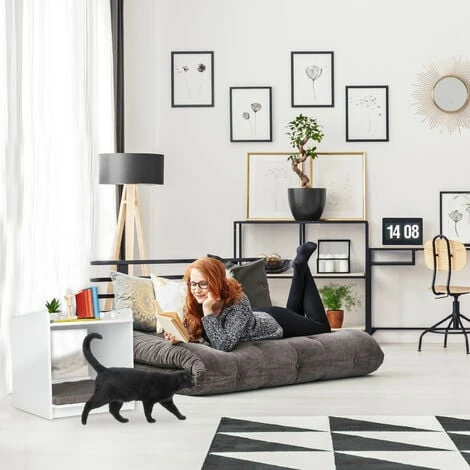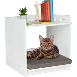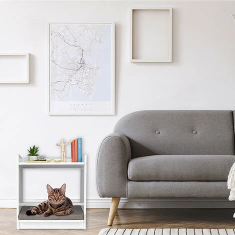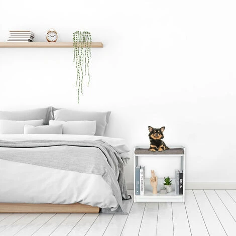 Questa originale combinazione di tavolino da salotto e cuccia per animali non è soltanto pratica ma estremamente decorativa. Crea spazio aggiuntivo in soggiorno e in camera da letto con questo comodino multifunzionale e offri al tuo animale domestico un posto accogliente per dormire. All’interno del piccolo tavolo dal design moderno e armonioso, gatti o piccoli cani possono mettersi comodi sul morbido cuscino. Il ripiano superiore della cuccia offre spazio per decorazioni, riviste e libri.
