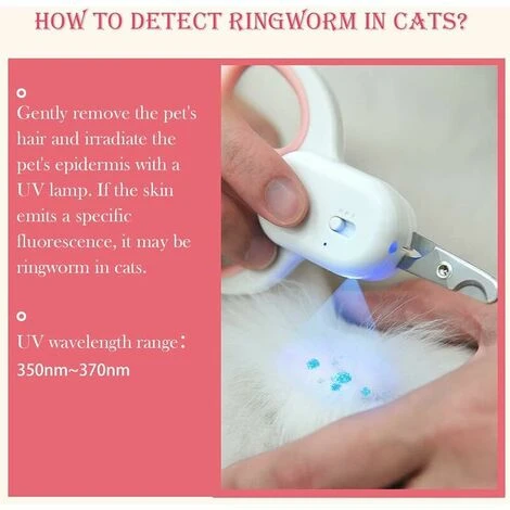 【FACILE DA USARE】 I tagliaunghie per animali domestici sono semplici da usare. L’interruttore del tagliaunghie può essere spostato su e giù. Scorri verso l’alto per accendere la luce LED e scorri verso il basso per la luce UV. Come testare la tigna negli animali domestici: rimuovere i peli dell’animale e irradiare la pelle con la lampada UV. Se c’è una fluorescenza specifica, il tuo gatto potrebbe avere la tigna