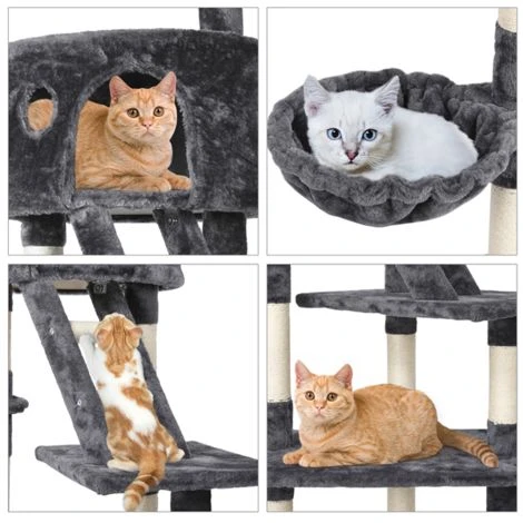 - Comodo e Divertente: l’albero tiragraffi per gatti è dotato di due condomini spaziosi preparati per un piccolo riposo e due amache offrono una diversa opzione di fare un pisolino; pali arrotolati con corde di sisal contribuiscono a sviluppare un’abitudine ai graffi positiva; 2 palle di peluche c gatti con cui giocare e sviluppare la loro flessibilità.
