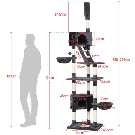 - Altezza Regolabile: la lunghezza del palo superiore può essere regolata da 37 cm a 64 cm, quindi l’altezza dell’albero tiragraffi per gatti va da 228 cm a 255 cm, molto più comodo per attaccare l’albero del gatto contro il soffitto per una maggiore stabilità. Può anche essere rimosso per soddisfare le tue esigenze.